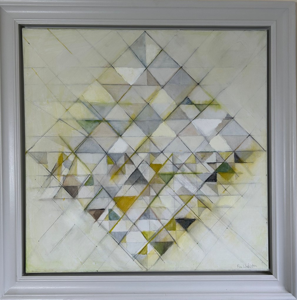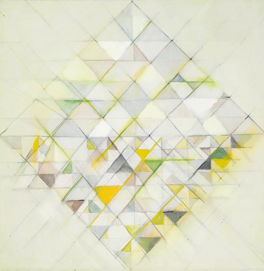 Oil paint and graphite diamond shapes some are coloured and in others the ground colour comes through defined by the graphite, creating a glass like transparency.