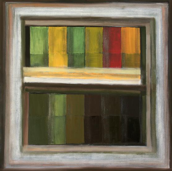 Yellow mixed with primary colours framed in oil paint creating an illusion of perspective.