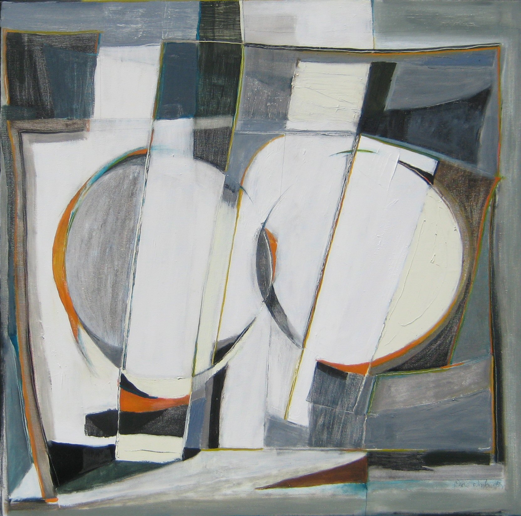 Monochrome palette, orange accents, vertical and horizontal lines creating space and movement and breaking the rules of perspective.
