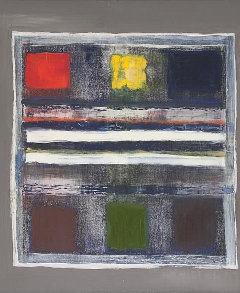 Above the horizontal stripes are red, yellow and blue squares on a sandpapered background of Prussian Blue. Below three squares, the result of mixing Prussian Blue with the above primaries. On a grey surround.