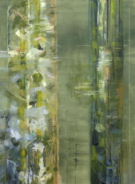 Impression of trees and lake. The flat grey green represents the stillness and the energetic brush strokes the turbulence found in nature.