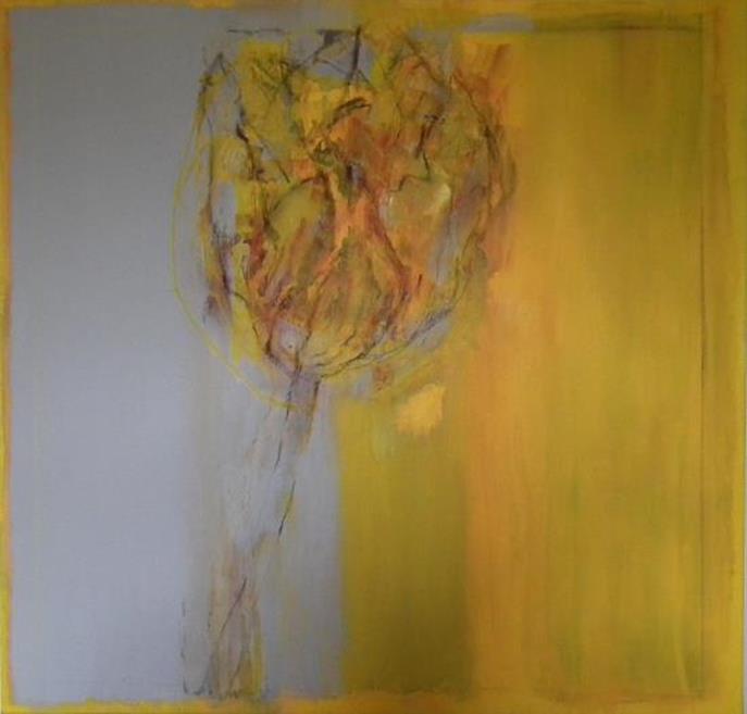 On a background of grey and yellow an impression of a red and yellow striped tulip.